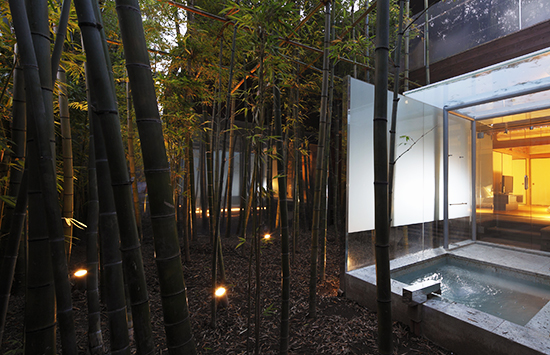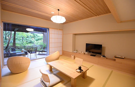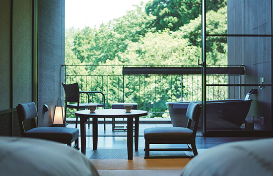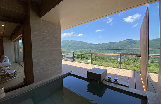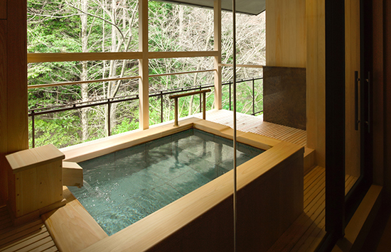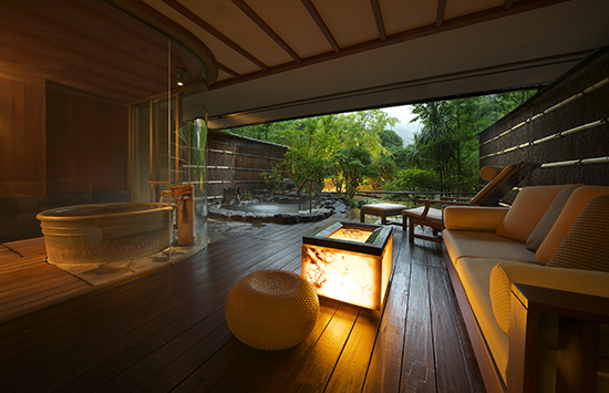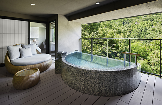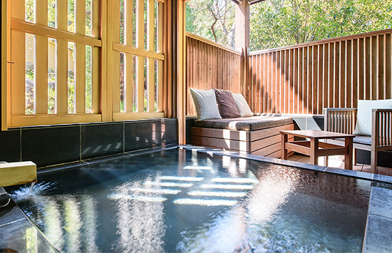 湯河原の渓谷に佇む数寄屋造りの宿。檜と十和田石で広めにあつらえた客室の露天風呂は、湯河原の風に吹かれて湯に浸かれるプライベートな空間。湯上がりは広縁のソファに身を委ね、ほっと一息つくのも贅沢なひとときです。