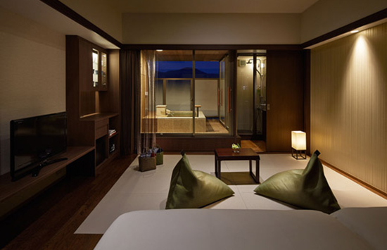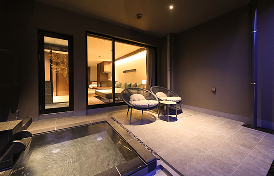 全室テラス&キッチン付きのスイート仕様。その中でも「温泉露天風呂付き スタンダードルーム」は、約50㎡の空間に温泉露天風呂と連泊にうれしいキッチン、大きなソファやテラスなどを完備し、暮らすように滞在できます。