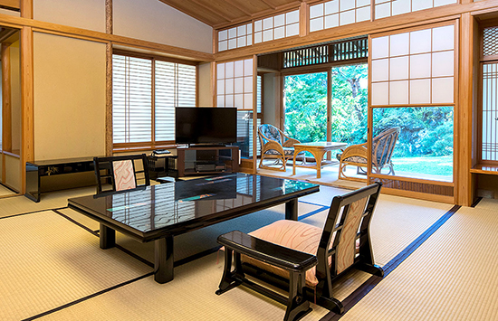 銘木を使用し、和の意匠を凝らした数寄屋造りの宿。客室は本館のほか、日本庭園内に離れが佇みます。料亭旅館を謳う宿でいただけるのは、丁寧にひいた出汁をベースにした京風会席。滋味なる味わいを堪能した後は、相模湾を見渡す展望風呂で熱海の湯を心ゆくまでどうぞ。