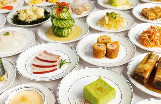 世紀の美食家・西太后や皇帝に提供された中国清朝時代の宮廷料理を今に伝える稀有な料理店。中国桂林の山並みをイメージしたハイバックソファは西太后の愛した翡翠色。霧をイメージしたオーガンジーで仕切られています。
