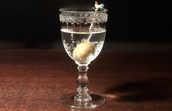 1920年代のアメリカンバーをイメージした洒脱な空間にカウンター席が8席。バックバーには厳選したボトルと、店主がヨーロッパで買い集めたアンティークのグラスが並びます。年代もののウイスキーやコニャック、マール、追熟したフルーツを使ったカクテルもぜひ。