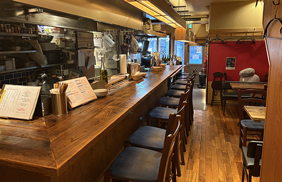 ライブ感溢れる21席のオープンカウンターを中心とした居心地の良い空間。イタリアンをメインに、和洋中の要素も取り入れたジャンルレスの料理は、固定メニューを一切設けず、その日仕入れた旬の食材で料理を組み立てるスタイル。いつ来ても新たな一皿に出会えます。