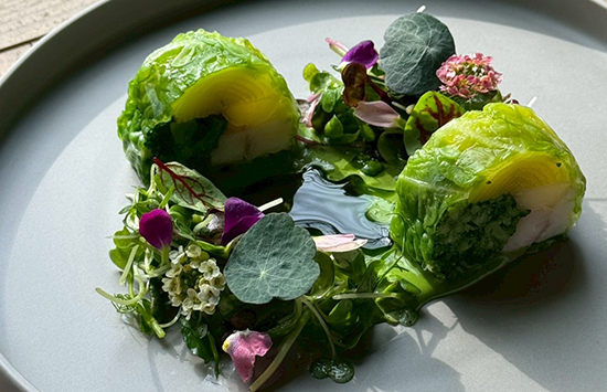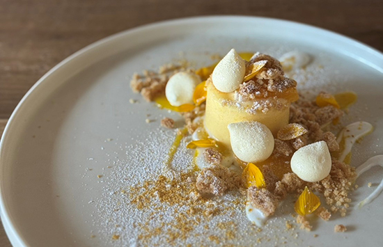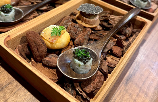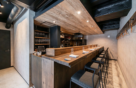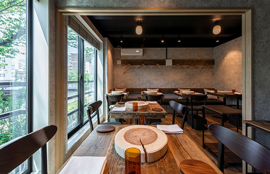 フランス料理のクラシックな技法と薪火による野趣や香りを融合させた“薪火フレンチ”。薪香を纏わせた肉や燻製した魚など、すべての皿に薪火の香りや火入れの技術を取り入れ、味の深みや幅を広げています。2階は桜並木が続く川沿いの景色を望むテーブル席をご用意。